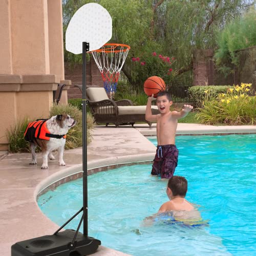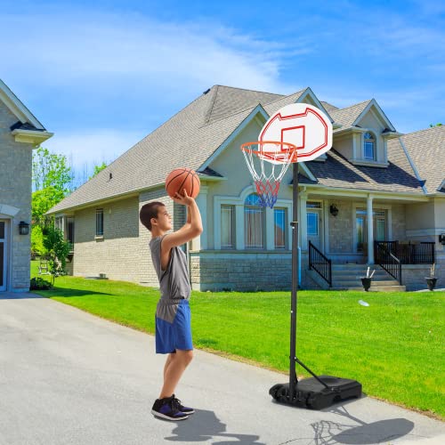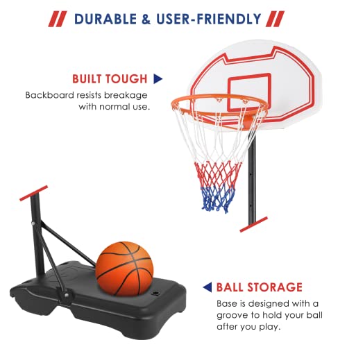 【HALTBARES ALLWETTER】Der Basketballkorb für Kinder verwendet Eisenrohr, PVC Basketballbrett und eine hochdichte PE-Basis. Das Allwetternetz aus Nylon hat eine lange Lebensdauer und hält auch schlechtem Wetter stand.