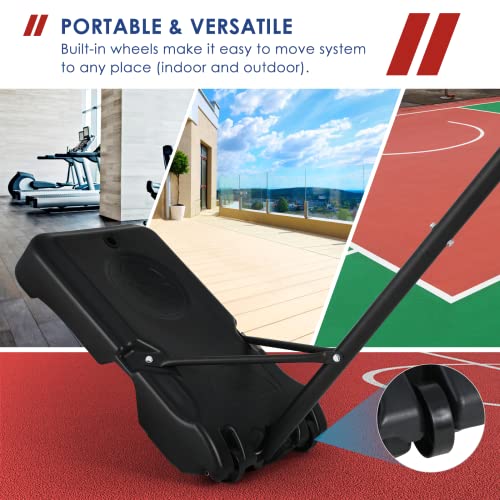 【PRATISCHES DESIGN】Eine tiefe Aussparung auf dem Standfuß sorgt für die Platzierung für Ihren Basketball. Darüber hinaus ermöglichen zwei vordere Stützräder die leicht Bewegung.